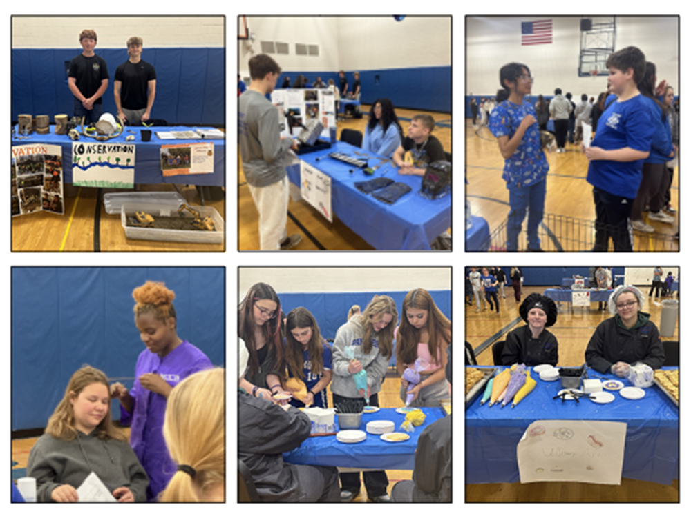 Juniors and seniors enrolled in the Culinary, Cosmetology, Construction Technology, Conservation, Criminal Justice, Automotive Technology, Automotive Body Repair, Small Animal Science, Health Careers, Sports Conditioning and Exercise Science, and Welding and Metal Fabrication set up information tables in the gymnasium for the career fair.