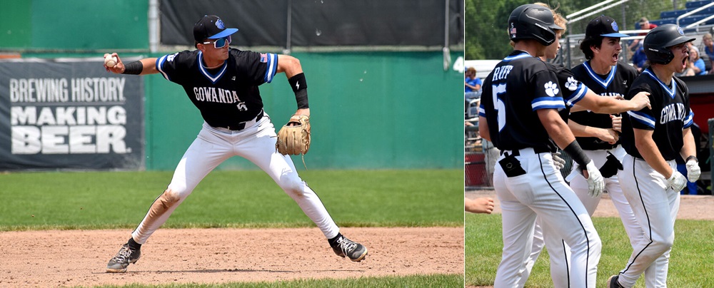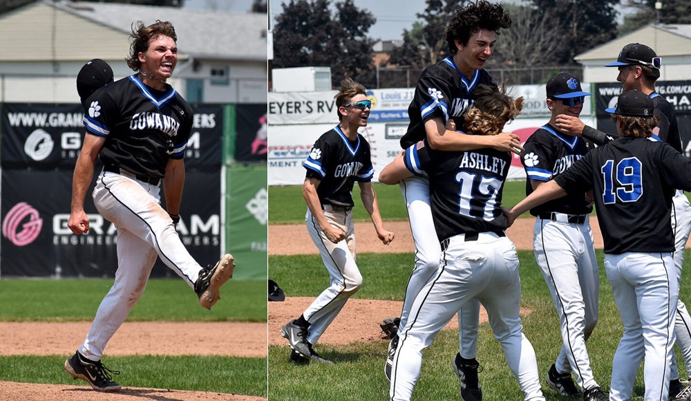 OBSERVER Photos by Matt Spielman Above, left, Gowanda's Blake Herman celebrates following the final out of Saturday's 8-1 Class C Far West Regional win over Kendall at Dwyer Stadium in Batavia. Above, right, Gowanda's Seth Geiger and Landen Ashley (17) celebrate following Saturday's 8-1 Class C Far West Regional win over Kendall at Dwyer Stadium in Batavia.