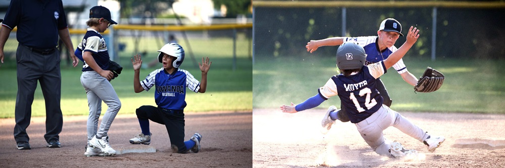 Photos courtesy of Steve Garvey Above left, Gowanda's Maverick Olszewski requests time out after sliding into second base as Falconer's Colin Moyer looks. Above, right, Gowanda's Jayce Hubbard attempts to tag out Falconer's Colin Moyer.