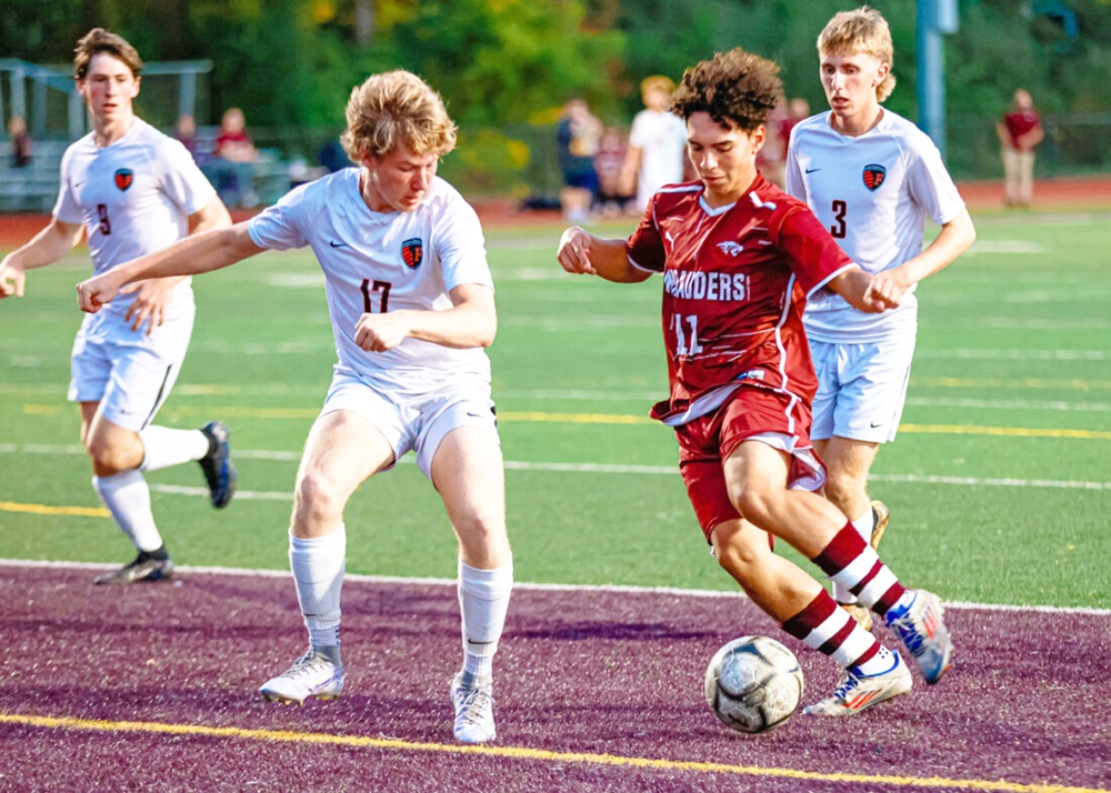 OBSERVER Photo by Ashleigh Brown Dunkirk's Erick Millan attempts to cut inside of Fredonia's Seth Davidson (17) as the Hillbillies' Jackson Stellrecht (3) looks on during Tuesday's CCAA Division I boys soccer game at Karl Hoeppner Field in Dunkirk.