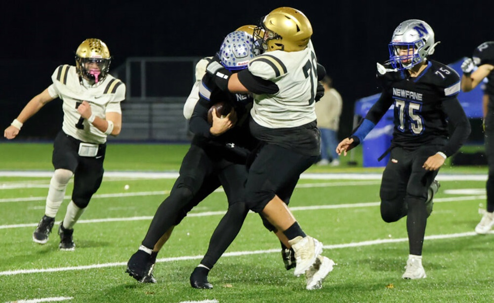 OBSERVER Photo by Jon Neubauer | Sideline Images of WNY Silver Creek/Forestville's Vince Prinzbach brings down Newfane quarterback Mac Capen for a sack during the Section VI Class D football semifinals Friday night.