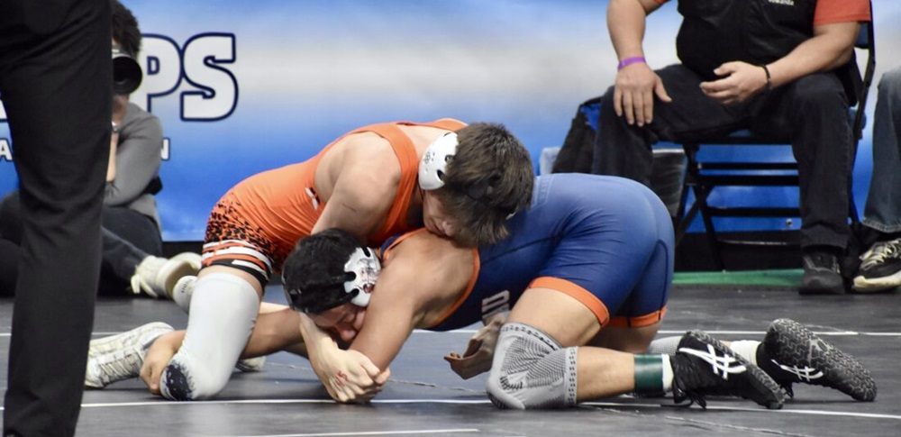 Gowanda/Pine Valley's Nathan Warrior controls his opening match at 144 pounds in the Division 2 bracket of the NYSPHSAA wrestling championships at MVP Arena in Albany on Friday morning. Warrior won his match against Diego Villacis of North Shore-VIII with a pin at 2:26. OBSERVER photo by Christian Storms