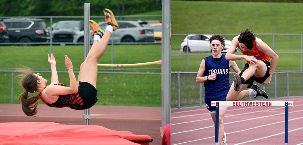 Above, left, Fredonia's Mariella Russo clears the bar in the high jump during Tuesday's CCAA track and field meet against Southwestern at the Fran Sirianni Athletic Complex in West Ellicott. Above, right, The Hillbillies' Nathan Keefe competes in the 400-meter hurdles. OBSERVER Photos by Christian Storms